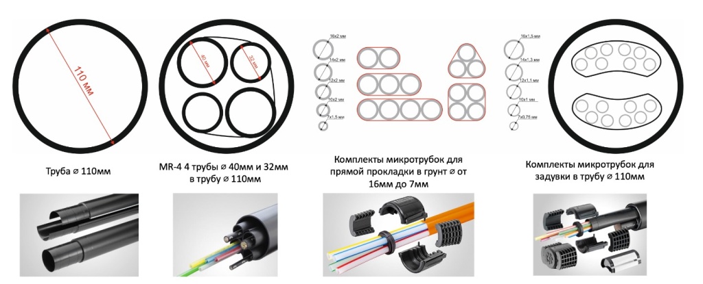 Новые сети предлагается строить используя 3-5 трубок (количество и диаметр трубок не регламентированы и зависят от конкретного проекта) для прямой прокладки в грунт с возможностью задувки в каждую трубку от 8 до 288 волокон.