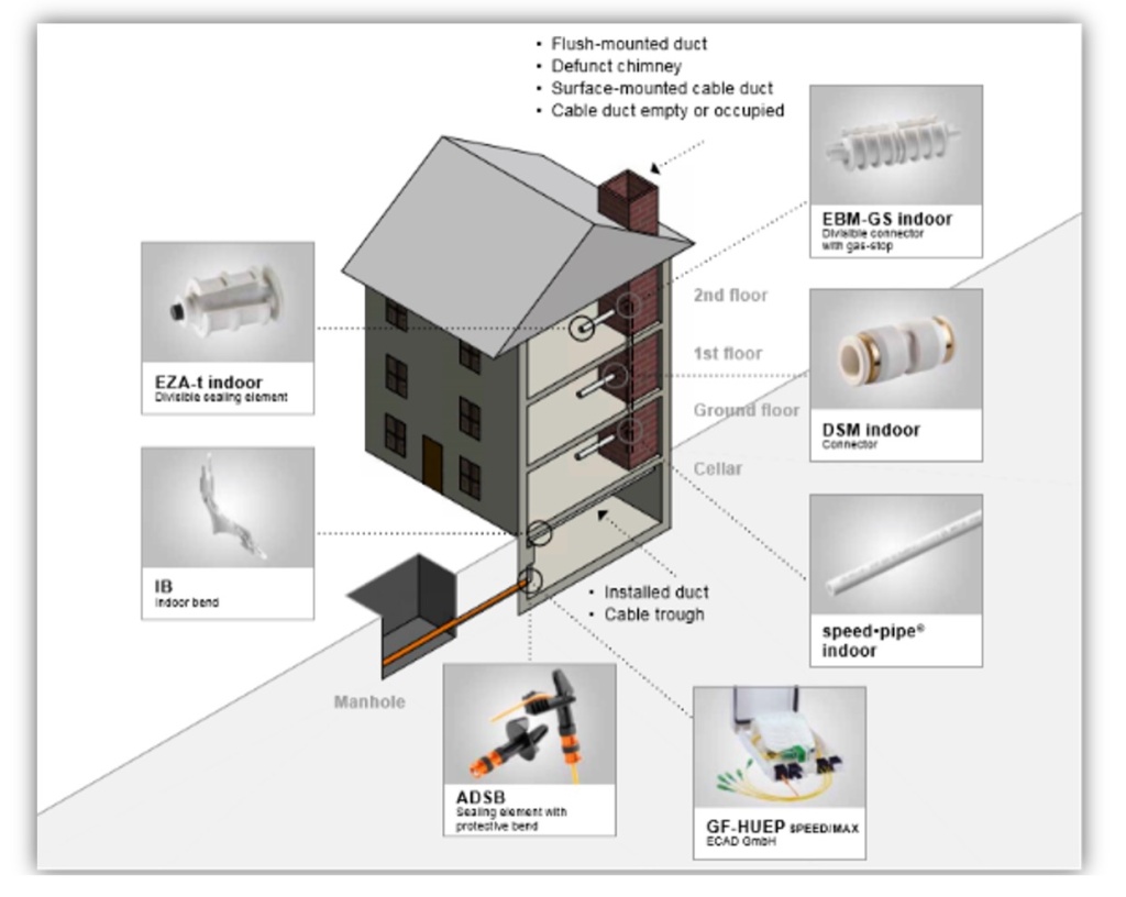 Трудно воспламеняющаяся, не поддерживающая горение, безгалогенная микротрубка приходит непосредственно до точки распределения в квартире/этаже. Все фитинги, соединители, держатели предусматривают соблюдение радиуса изгиба для идеальной задувки кабеля