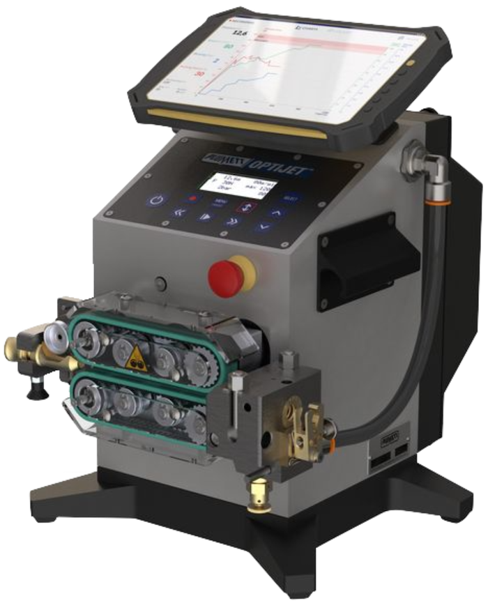 Новейшая модель задувочной машины Plumett в новом дизайне с усовершенствованными характеристиками для всего сегмента микроканализации. OptiJet может быть оснащен планшетом с защитой IP67, превосходящий функции Intelli-box. Помимо измерения всех сил воздействующих на кабель в процессе задувки, а именно силы толкания и силы воздушного потока, расчета скорости и построения графика зависимости сил и скорости от времени, OptiJet версии Reporting позволяет в системах IoT передавать данные по Wi-Fi, по Bluetooth в цифровое облако, где возможно работать с данными по каждому проложенному кабелю и по каждой машине, производящей задувку.