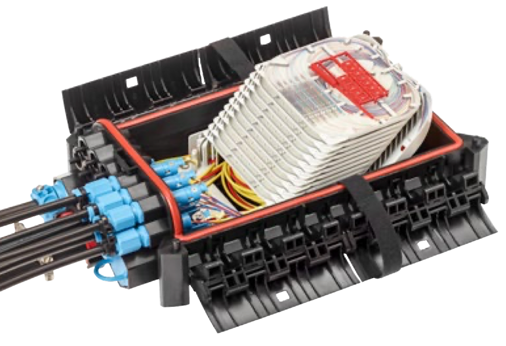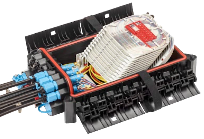 Корпус муфты изготовлен из армированного стекловолокном полипропилена, водонепроницаемый, стойкий к УФ излучению. Конструктивно муфта состоит из основания с расположенным в нем органайзером для оптических кассет, мест для ввода кабелей, механических защелок и крышки.