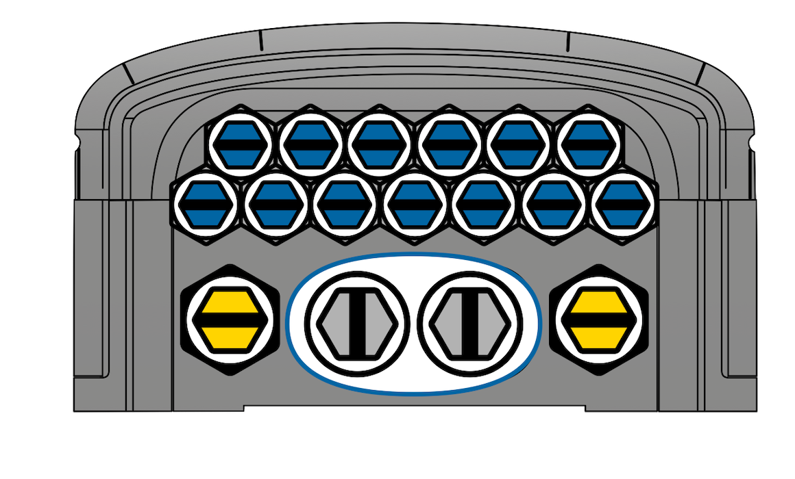 ECAM D18 - 1 шт. (овальный ввод под кабель диаметром 6-18 мм); ECAM S9.5 - 13 шт. (ввод под кабель диаметром 3,5-9,5 мм); ECAM S18 - 2 шт. (ввод под кабель диаметром 5-18 мм); Вместо овального ввода ECAM D18 есть возможность установить два ввода ECAM S12 (ввод под кабель диаметром 4-12 мм). |