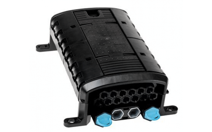 По умолчанию муфта BPEO-S1.5-FDP-Branch поставляется, как пустой корпус. Внутри установлен только органайзер на 12 слотов и заглушены 15 одинарных и один двойной (овальный) кабельные вводы.
