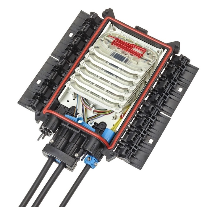 Корпус муфты изготовлен из армированного стекловолокном полипропилена, водонепроницаемый, стойкий к УФ излучению. Конструктивно муфта состоит из основания с расположенным в нем органайзером для оптических кассет, мест для ввода кабелей, механических защелок и крышки.