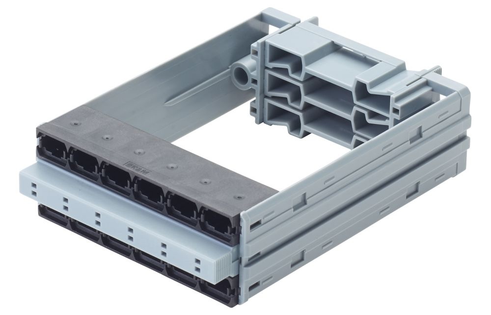 Блок с 12 сквозными портами MPO на лицевой (по 6 портов сверху и снизу) и зеркально на внутренней сторонах. В центре на лицевой стороне расположена панель со светодиодами и радочастотными метками RFID для системы управления inteliPhy. |