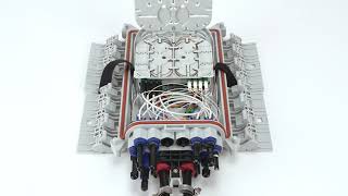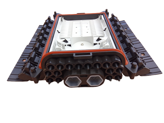 Корпус муфты изготовлен из армированного стекловолокном полипропилена, водонепроницаемый, стойкий к УФ излучению. Конструктивно муфта состоит из основания с расположенным в нем органайзером для оптических кассет, мест для ввода кабелей, механических защелок и крышки.