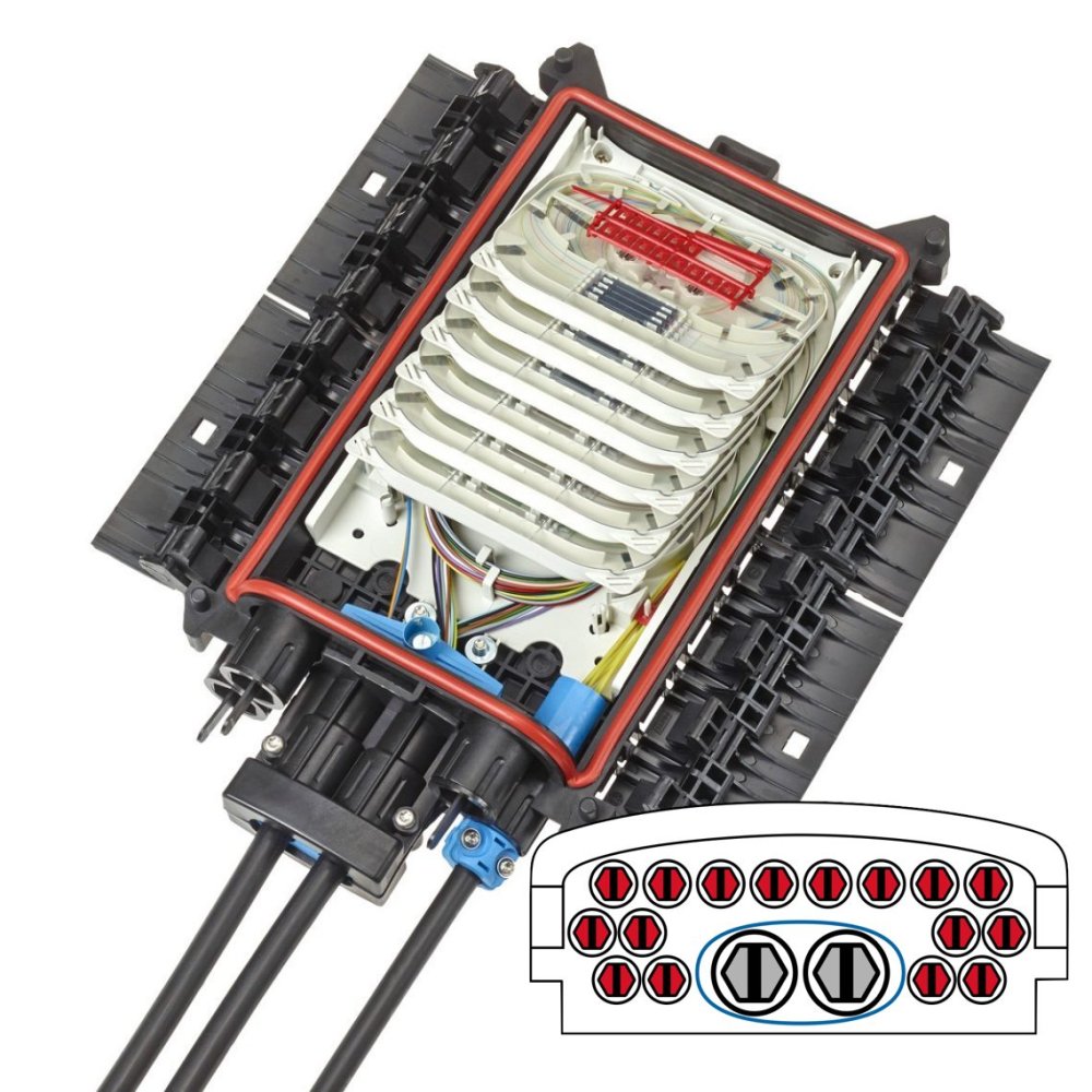 По умолчанию муфта BPEO-S1-FDP-Branch поставляется, как пустой корпус. Внутри установлен только органайзер на 12 слотов и заглушены 16 одинарных и один двойной (овальный) кабельные вводы.